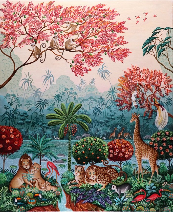 Cette peinture acrylique sur toile de lin a été réalisée dans mon atelier d’Angoulême en Charente ou je réside depuis 1990.sa date de création est 2021. Cette peinture pourrait être classée dans le style de la peinture naïve (dont le douanier Rousseau fut le chef de file au début du XXème siècle, et dont je me suis beaucoup inspirée à mes débuts) Toutes les peintures acryliques sont soigneusement encadrées dans un cadre noir (caisse américaine) . Elle possède une accroche réglable à l’arrière. Elles sont toutes accompagnées d’un certificat d’authenticité collé à l’arrière de la toile.
