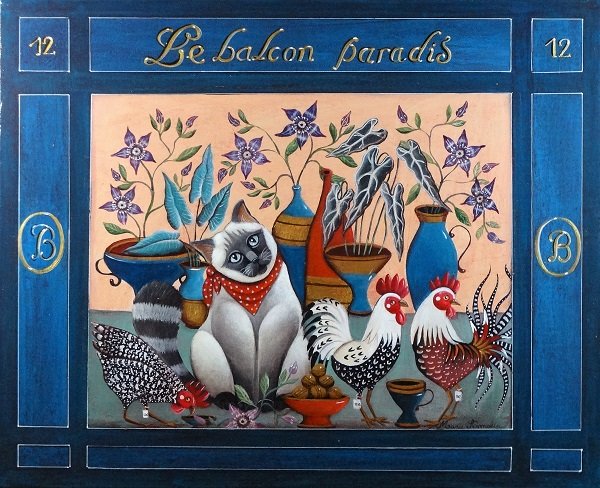 Cette acrylique sur toile de lin mesure : 33 cm x 41 cm. Elle a été réalisée dans mon atelier d’Angoulême en Charente ou je réside depuis 1990.sa date de création est 2018. Cette peinture pourrait être classée dans le style de la peinture naïve (dont le douanier rousseau fut le chef de file au début du XXème siècle, et dont je me suis beaucoup inspirée à mes débuts).toutes les peintures acryliques sont soigneusement encadrées dans un cadre noir (caisse américaine) . Elle possède une accroche réglable à l’arrière.