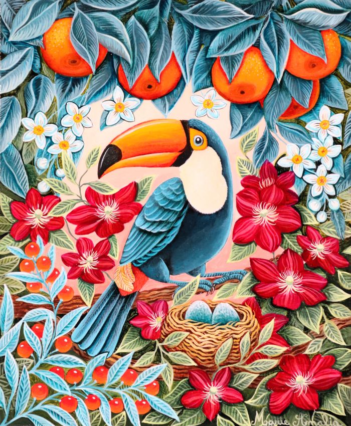 Cette peinture acrylique sur toile a été réalisée dans mon atelier d’Angoulême en Charente ou je réside depuis 1990. Sa date de création est 2025. Cette peinture pourrait être classée dans le style de la peinture naïve https://fr.wikipedia.org/wiki/Art_na%C3%AFf(dont le douanier Rousseauhttps://fr.wikipedia.org/wiki/Henri_Rousseau fut le chef de file au début du XXème siècle, et dont je me suis beaucoup inspirée à mes débuts). Toutes les peintures acryliques sont soigneusement encadrées dans un cadre noir (caisse américaine)https://fr.wiktionary.org/wiki/caisse_am%C3%A9ricaine . Elle possède une accroche réglable à l’arrière. Elles sont toutes accompagnées d’un certificat d’authenticité collé à l’arrière de la toile.